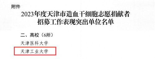 近日,天津市红十字会发布了《关于表扬2023年度天津市造血干细胞志愿捐献者招募工作表现突出单位的通报》,对在2023年度造血干细胞志愿捐献者招募工作中表现突出的河西区红十字会等8家区红十字会,以及结合大学生思政教育开展造血干细胞志愿捐献者招募活动卓有成效的6所高校予以通报表扬,天津工业大学获评天津市造血干细胞志愿捐献者招募工作表现突出单位。