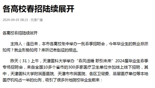 (录音:我们专门邀请了天津的所有大学医院的用人单位领导,来到了我们现场,各学院也向这些医院来介绍我们医学生的专业特点、培养的方向,为这些个我们培养的人能够更好的留津,为天津服务做贡献。)