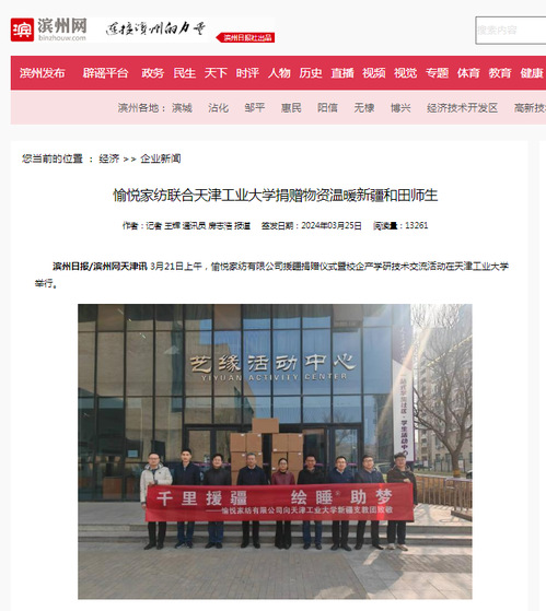 滨州日报/滨州网天津讯 3月21日上午,愉悦家纺有限公司援疆捐赠仪式暨校企产学研技术交流活动在天津工业大学举行。
