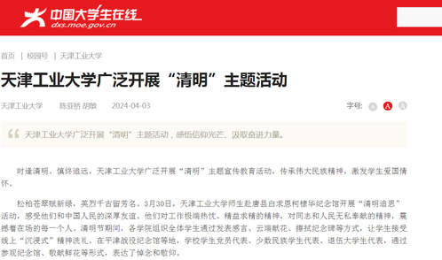 时逢清明、慎终追远,天津工业大学广泛开展“清明”主题宣传教育活动,传承伟大民族精神,激发学生爱国情怀。