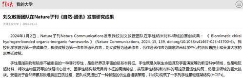 2024年1月2日,Nature子刊Nature Communications发表我校刘义教授团队在手性纳米材料领域的原创成果: 《 Biomimetic chiral hydrogen-bonded organic-inorganic frameworks 》 (Nature Communications, 2024, 15, 139, doi.org/10.1038/s41467-023-43700-6)。我校化学学院为第一完成单位,郭俊教授为第一作者兼通讯作者,刘义教授为通讯作者,合作通讯作者为国家纳米科学中心的唐智勇院士和天津大学的赵美廷教授。