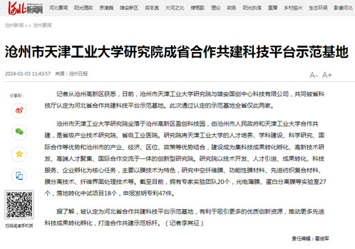 记者从沧州高新区获悉,日前,沧州市天津工业大学研究院与雄安国创中心科技有限公司,共同被省科技厅认定为河北省合作共建科技平台示范基地。此次通过认定的示范基地全省仅此两家。