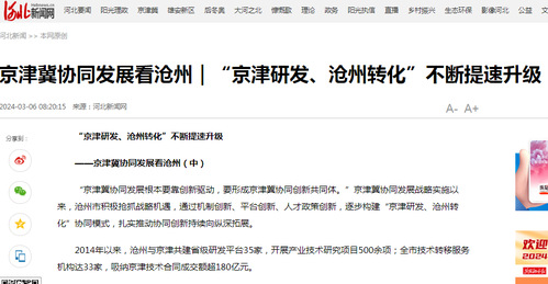目前,沧州与京津共建省级研发平台35家,开展产业技术研究项目500余项;全市技术转移服务机构达到33家,吸纳京津技术合同成交额超180亿元。