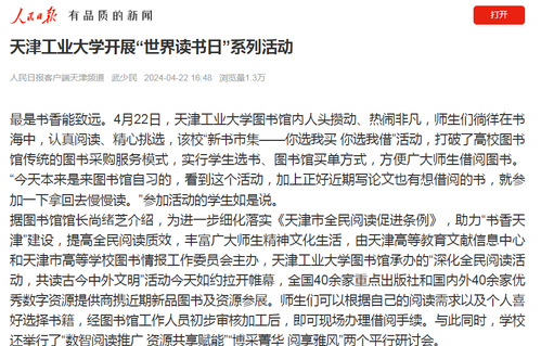 艺术学院繁星志愿者赴高庄子社区开展“最美人间四‘阅’天,春风漫卷书香来”绿叶书签制作活动,大小朋友一起共创环保绿色书签,小小的书签,承载着孩子们对阅读的热爱和对地球的关怀,成为连接知识与环境的绿色使者。药学院联合皮卡书屋、种子博物馆在万科四季花城社区开展“走进中医药”读书日活动,物理科学与技术学院学生赴天津棉3创意街区参加海河旧书集市活动,机械工程学院开展“我爱读书”主题手抄报绘制活动,纺织科学与工程学院、化学工程与技术学院开展系列读书分享会,计算机科学与技术学院联合大寺中学通过读书分享、拼贴诗等活动,引导大中小学生多读书、读好书。人文学院举办“春日来信”读书会活动,在书香与温情的交织中绘制出一幅动人的春日画卷。在新疆和田,学校援疆支教团在支教学校开展“大手拉小手”幼儿经典故事阅读活动。在天津蓟州,学校天津市创业奖学金获得者李响带领蓟乡希望创业团队联合蓟州区政协文化和文史资料委员会在柒号小院民宿坊举办“‘阅’动龙年 ‘读’享人生”读书分享会......