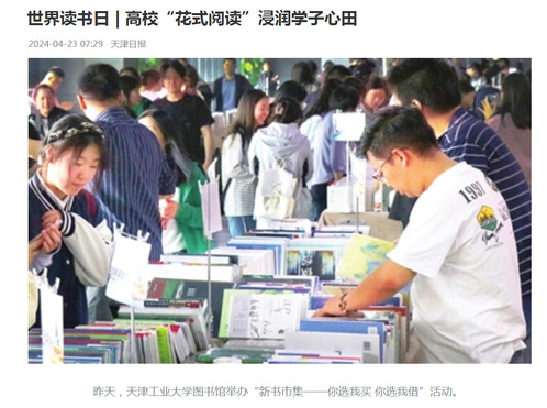 天津大学因地制宜创设校园读书环境:学校在“一站式”学生社区提供一站式阅读服务,根据不同学院、学科的借阅数据特征,定制个性化电子资源即“一页纸书展”,让学生在学院或宿舍区便可获取“专业对口”的图书信息;学校在北洋园校区图书馆精心打造了占地面积约260平方米的“天大文库”阅览室,集文献收藏、展示宣传、阅览研讨功能于一体;位于该校卫津路校区的科学图书馆修葺一新,吸引了众多学子前往体验。