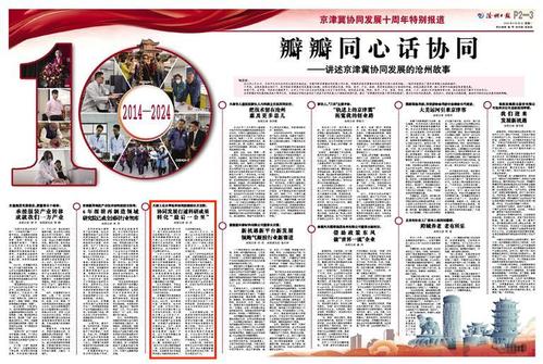 在京津冀协同发展战略实施十周年之际,本报组织多路记者采访了受益于协同发展10个领域的典型代表,推出“京津冀协同发展十周年特别报道”,展示沧州协同发展成果,坚定信心,抢抓重大战略机遇,推动沧州经济社会发展实现新跨越。