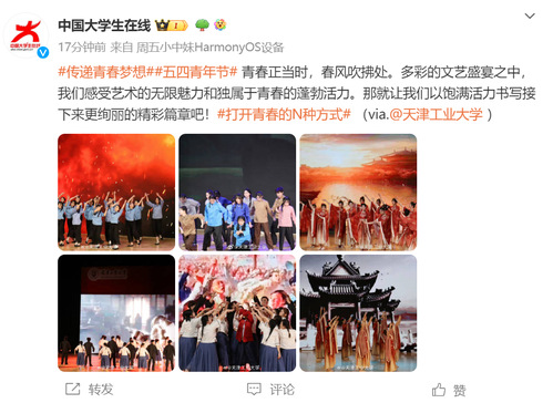 #传递青春梦想##五四青年节# 青春正当时,春风吹拂处。多彩的文艺盛宴之中,我们感受艺术的无限魅力和独属于青春的蓬勃活力。那就让我们以饱满活力书写接下来更绚丽的精彩篇章吧!#打开青春的N种方式# (via.@天津工业大学 )