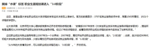 这位职业规划与就业指导专家以2007年为一个分界线:2007年后,高校开始开设职业生涯规划课程,进入“2.0阶段”;此前,自20世纪90年代初起大学生就业转为双向选择,少部分高校已开始尝试建设就业指导课程,即“1.0阶段”。