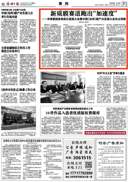 5月9日,京津冀国家高新区联盟大会暨中国(沧州)膜产业发展大会在沧州国际会议中心举行。这是京津冀国家高新区联盟成立以来在河北举办的首次大会。大会以“共享协同新机遇,聚力新质膜赛道”为主题,以膜产业为纽带,以G2京沪高速公路走廊为发展廊道,以培育膜产业新质生产力为示范,推进沿线高新区协同创新与产业协作,加快形成和发展新质生产力,驱动京津冀区域整体产业结构迭代升级。