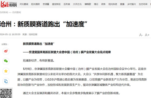 5月9日,京津冀国家高新区联盟大会暨中国(沧州)膜产业发展大会在沧州国际会议中心举行。这是京津冀国家高新区联盟成立以来在河北举办的首次大会。大会以“共享协同新机遇,聚力新质膜赛道”为主题,以膜产业为纽带,以G2京沪高速公路走廊为发展廊道,以培育膜产业新质生产力为示范,推进沿线高新区协同创新与产业协作,加快形成和发展新质生产力,驱动京津冀区域整体产业结构迭代升级。