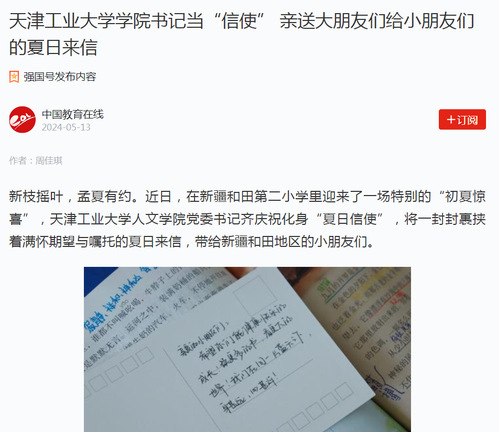 新枝摇叶,孟夏有约。近日,在新疆和田第二小学里迎来了一场特别的“初夏惊喜”,天津工业大学人文学院党委书记齐庆祝化身“夏日信使”,将一封封裹挟着满怀期望与嘱托的夏日来信,带给新疆和田地区的小朋友们。