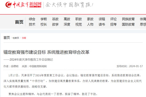 1月17日,天津召开了2024年度教育工作会议。会议指出,锚定教育强市建设目标,系统推进教育综合改革,深入实施高质量发展“十项行动”,加快建设高质量教育体系,办好人民满意的教育,为全面建设社会主义现代化大都市提供基础性、战略性支撑。
