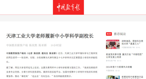 中国教育报客户端讯(记者 陈欣然 通讯员 陈亚桥)近日,天津工业大学环境科学与工程学院的两位老师——张佰林、石聪,分别被聘为天津市第五十七中学和河北区育婴里小学的科学副校长。
