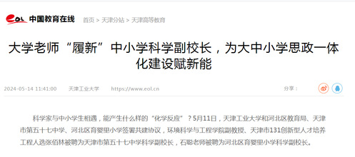 科学家与中小学生相遇,能产生什么样的“化学反应”?5月11日,天津工业大学和河北区教育局、天津市第五十七中学、河北区育婴里小学签署共建协议,环境科学与工程学院副教授、天津市131创新型人才培养工程人选张佰林被聘为天津市第五十七中学科学副校长,石聪老师被聘为河北区育婴里小学科学副校长。