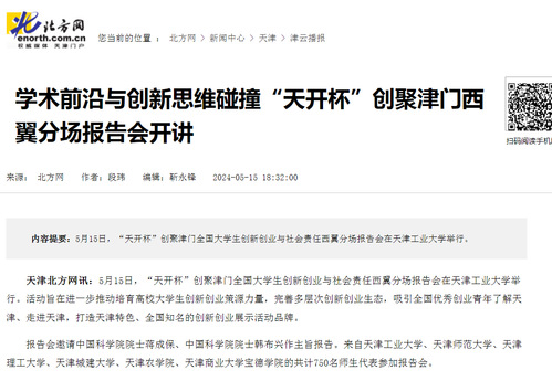 天津北方网讯:5月15日,“天开杯”创聚津门全国大学生创新创业与社会责任西翼分场报告会在天津工业大学举行。活动旨在进一步推动培育高校大学生创新创业策源力量,完善多层次创新创业生态,吸引全国优秀创业青年了解天津、走进天津,打造天津特色、全国知名的创新创业展示活动品牌。