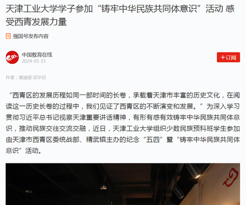 “西青区的发展历程如同一部时间的长卷,承载着天津市丰富的历史文化,在阅读这一历史长卷的过程中,我们见证了西青区的不断演变和发展。”为深入学习贯彻习近平总书记视察天津重要讲话精神,有形有感有效铸牢中华民族共同体意识,推动民族交往交流交融,近日,天津工业大学组织少数民族预科班学生参加由天津市西青区委统战部、精武镇主办的纪念“五四”暨“铸牢中华民族共同体意识”活动。