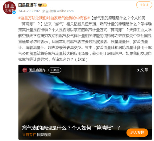 #这些方法让我们对自家燃气做到心中有数#【燃气表的原理是什么?个人如何“算清账”?】近来“燃气”相关话题几登热搜。燃气计量的原理是什么?怎样确定其计量是否准确?个人是否可以掌控的燃气计量方式“算清账”?天津工业大学航空航天学院研究发动机燃气及气体计量相关课题的讲师韩之雄在接受中新社国是直通车采访时表示,我国常用的燃气表主要包括皮膜表、质量流量计、罗茨流量计、涡轮流量计、超声波表等表具类型。其中,罗茨流量计和涡轮流量计多用于燃气公司贸易结算等燃气流量较大的应用场景,较少用于居民住户。如果我们发现自家燃气等计费异常,应该怎么办?(赵斌)