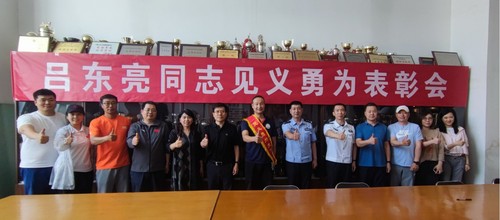 会上,张猛政委介绍了吕东亮老师见义勇为的先进事迹,并宣读对吕东亮同志见义勇为行为进行表彰的决定。李霖秘书长和蔺洪全部长为吕东亮老师颁发见义勇为行为确认证书、奖牌和奖励金。