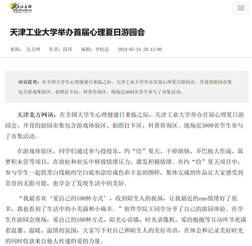 天津北方网讯:在全国大学生心理健康日来临之际,天津工业大学举办首届心理夏日游园会,开设的游园市集包含游戏体验区、拍照打卡区、科普咨询区。现场近3000名学生参与了市集活动。