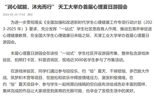 为进一步贯彻落实《全面加强和改进新时代学生心理健康工作专项行动计划(2023-2025 年)》要求,充分发挥“一站式”学生社区思政育人作用,推动五育并举促进心理健康教育,在全国大学生心理健康日来临之际,天津工业大学举办首届心理夏日游园会。