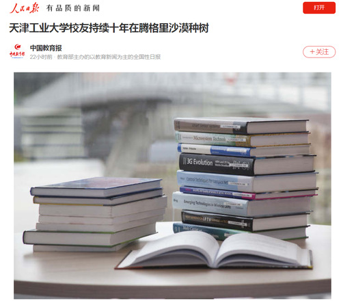 据悉,2014年5月,来自广东、上海、浙江、北京、天津、陕西、宁夏等地的近30名校友来到阿拉善腾格里沙漠锁边生态公益基地,开启了“天津工业大学校友生态家园”“天津工业大学校友林”的首创之举。十年里,各地校友认种丝棉木、香花槐、金叶榆乔木林1200棵。广大校友大力践行绿色发展理念,为我国西部防沙治沙事业作出了积极贡献。
