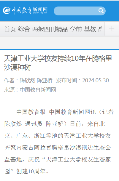 据悉,2014年5月,来自广东、上海、浙江、北京、天津、陕西、宁夏等地的近30名校友来到阿拉善腾格里沙漠锁边生态公益基地,开启了“天津工业大学校友生态家园”“天津工业大学校友林”的首创之举。10年里,各地校友认种丝棉木、香花槐、金叶榆乔木林1200棵。广大校友大力践行绿色发展理念,为我国西部防沙治沙事业作出了积极贡献。