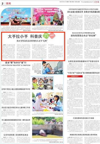 本报讯(记者 姜凝)校园中的趣味科普实验、社区里的志愿服务市集、非遗手工制作……“六一”国际儿童节到来之际,我市多所高校组织开展丰富多彩的主题活动,通过大学师生带领小朋友进行科普实践、志愿服务、体验非遗技艺等活动,为少年儿童送上一份份特别的儿童节“礼物”。