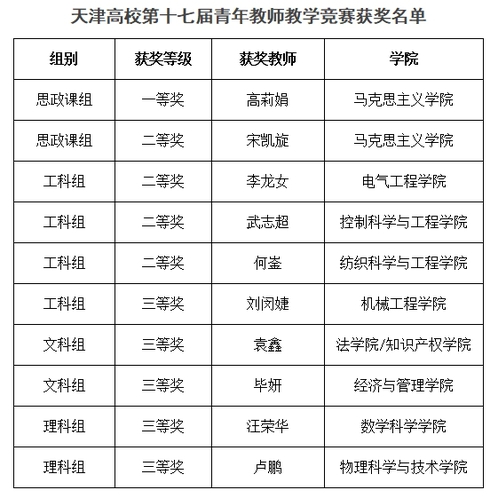 日前,市总工会、市委教育工委、市教委印发《关于天津高校第十七届青年教师教学竞赛结果的通报》,公布了参赛选手成绩排名和对应奖项。我校选派的10位青年教师斩获一等奖1名、二等奖4名、三等奖5名,其中,马克思主义学院高莉娟老师获得思政课组一等奖,我校荣获优秀组织奖。