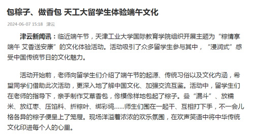 津云新闻讯:临近端午节,天津工业大学国际教育学院组织开展主题为“粽情享端午 艾香送安康”的文化体验活动。活动吸引了众多留学生参与其中,“浸润式”感受中国传统节日的文化魅力。