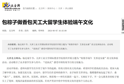 天津北方网讯:临近端午节,天津工业大学国际教育学院组织开展主题为“粽情享端午 艾香送安康”的文化体验活动。活动吸引了众多留学生参与其中,“浸润式”感受中国传统节日的文化魅力。