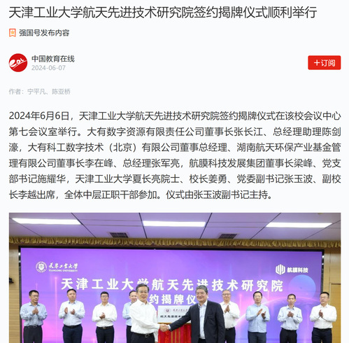 2024年6月6日,天津工业大学航天先进技术研究院签约揭牌仪式在该校会议中心第七会议室举行。大有数字资源有限责任公司董事长张长江、总经理助理陈剑濠,大有科工数字技术(北京)有限公司董事总经理、湖南航天环保产业基金管理有限公司董事长李在峰、总经理张军亮,航膜科技发展集团董事长梁峰、党支部书记施耀华,天津工业大学夏长亮院士、校长姜勇、党委副书记张玉波、副校长李越出席,全体中层正职干部参加。仪式由张玉波副书记主持。