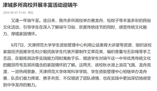 6月7日,天津师范大学学生资助管理中心利用公益美育大讲堂等资源,组织该校家庭经济困难学生和少数民族学生代表开展制作艾草花束、编织香囊与五彩绳等手工艺品,在锻炼其动手实践能力同时寓教于乐,增进学生对端午这一中华优秀传统文化的醒目符号及其所蕴含的家国情怀的了解。这两天,该校秋水湖上浪花飞溅、龙舟竞渡,一派热闹景象,天津师范大学体育科学学院、学生资助管理中心相继举办龙舟赛,队员们奋力挥桨、携手共竞,不仅增进了团队感情,也在实践中更加深切地感受到中华龙舟的魅力。