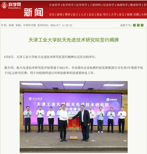 6月6日,天津工业大学航天先进技术研究院签约揭牌仪式在该校举行。