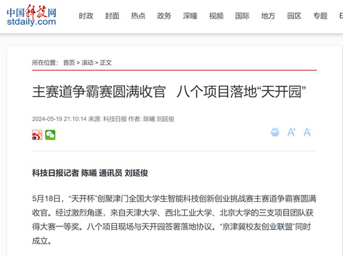 5月18日,“天开杯”创聚津门全国大学生智能科技创新创业挑战赛主赛道争霸赛圆满收官。经过激烈角逐,来自天津大学、西北工业大学、北京大学的三支项目团队获得大赛一等奖。八个项目现场与天开园签署落地协议。“京津冀校友创业联盟”同时成立。