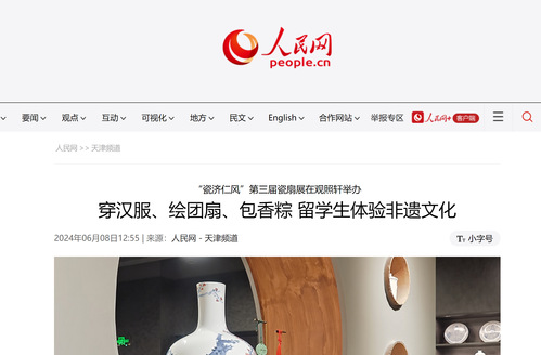 人民网天津6月8日电 (记者孙一凡)6月6日,在“文化与自然遗产日”及端午节来临之际,由天津市津南区文化和旅游局、津南区文学艺术界联合会、八里台镇人民政府指导,天津工业大学支持,津南区民间文艺家协会、观照轩(天津)文化传播有限公司主办的“瓷济仁风”第三届瓷扇展在天津市第一批市级非物质文化遗产传承体验基地观照轩举办。活动邀请天津工业大学十余位国内学生和外国留学生穿汉服、绘团扇、赏雅瓷、品香粽。