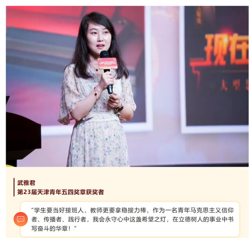 武雅君是天津工业大学马克思主义学院思政课教师,硕士生导师,中国社会科学院马克思主义研究院访问学者,荣获第23届天津青年五四奖章、第三届全国高校思想政治理论课教学展示活动一等奖、天津高校第十六届青年教师教学竞赛思政课组一等奖、天津市第二届基层理论宣讲员大赛教育系统分站赛第一名、天津市第三届研究生思想政治理论课教学比武一等奖、天津市第四届思想道德与法治课教学比武一等奖等多项荣誉。曾受邀参加录制津云《现在开讲》、人民网《初心映照新时代(第二季)》等大型思政节目,积极推动思政小课堂与社会大课堂紧密结合。
