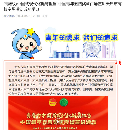 为深入学习宣传贯彻习近平总书记五四青年节对全国广大青年寄语精神,学习贯彻习近平总书记视察天津重要讲话精神,充分发挥先进典型在青少年思想政治引领中的积极作用,加大对中国青年五四奖章获奖者先进事迹宣传力度,让正能量成为大流量、大流量澎湃正能量,更好示范引领广大青少年为强国建设、民族复兴伟业挺膺担当,日前,“青春为中国式现代化挺膺担当”中国青年五四奖章百场宣讲天津市高校专场活动在天津医科大学成功举办。团市委、相关高校团组织负责同志以及高校团员青年代表约400人参加活动。