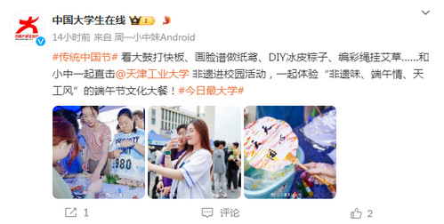 #传统中国节# 看大鼓打快板、画脸谱做纸鸢、DIY冰皮粽子、编彩绳挂艾草……和小中一起直击@天津工业大学 非遗进校园活动,一起体验“非遗味、端午情、天工风”的端午节文化大餐!#今日最大学#