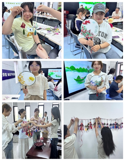 线怎么穿?结怎么打?口怎么封?穗儿怎么连?在法学院309会议室,艾香扑鼻、热闹非凡。师生们讨论切磋,互相帮助,缝香囊、做团扇,充分发挥想象力和创造力,各自展现着心灵手巧的本事。