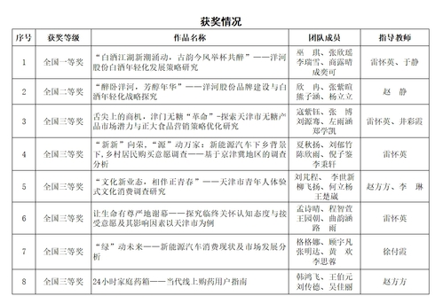 2024年6月1日至2日,由中国商业统计学会主办的“正大杯”第14届全国大学生市场调查与分析大赛总决赛在合肥工业大学举行。我校1支队伍获全国总决赛一等奖,1支队伍获全国总决赛二等奖,6支队伍获全国总决赛三等奖。此外,还有2支队伍获得天津市赛一等奖,1支队伍获得天津市赛三等奖。