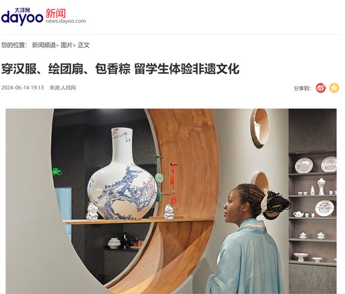 穿汉服、绘团扇、包香粽 留学生体验非遗文化人民网天津6月8日电 6月6日,在“文化与自然遗产日”及端午节来临之际,由天津市津南区文化和旅游局、津南区文学艺术界联合会、八里台镇人民政府指导,天津工业大学支持,津南区民间文艺家协会、观照轩(天津)文化传播有限公司主办的“瓷济仁风”第三届瓷扇展在天津市第一批市级非物质文化遗产传承体验基地观照轩举办。活动邀请天津工业大学十余位国内学生和外国留学生穿汉服、绘团扇、赏雅瓷、品香粽。(记者孙一凡)