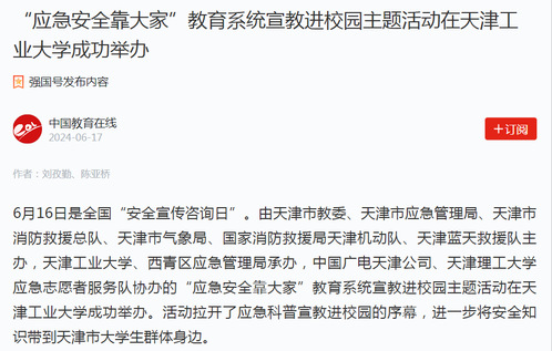 6月16日是全国“安全宣传咨询日”。由天津市教委、天津市应急管理局、天津市消防救援总队、天津市气象局、国家消防救援局天津机动队、天津蓝天救援队主办,天津工业大学、西青区应急管理局承办,中国广电天津公司、天津理工大学应急志愿者服务队协办的“应急安全靠大家”教育系统宣教进校园主题活动在天津工业大学成功举办。活动拉开了应急科普宣教进校园的序幕,进一步将安全知识带到天津市大学生群体身边。