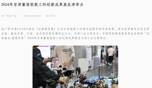 央广网天津6月18日消息(记者韩雨晨)为充分挖掘新工科建设过程中的优秀成果,助力优秀建设经验互学互鉴、融合共享,日前,由天津市教育委员会主办、天津工业大学承办、中国纺织服装教育学会支持的“创新融合 智慧共享”2024年京津冀高校新工科创新成果展在天津工业大学举办。