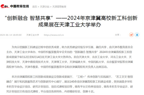 为充分挖掘新工科建设过程中的优秀成果,助力优秀建设经验互学互鉴、融合共享,由天津市教育委员会主办、天津工业大学承办、中国纺织服装教育学会支持的“创新融合 智慧共享”2024年京津冀高校新工科创新成果展于6月12日至6月14日在天津工业大学火热举办。来自天津大学、北京工业大学、河北工业大学、天津科技大学、天津中德应用技术大学、天津理工大学、天津城建大学、中国民航大学、北京服装学院等京津冀高校参与协办。天津市教委、中国纺织服装教育学会和京津冀高校有关负责人出席活动。