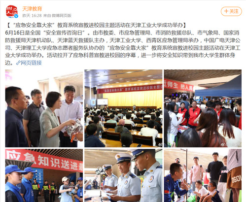 【“应急安全靠大家”教育系统宣教进校园主题活动在天津工业大学成功举办】6月16日是全国“安全宣传咨询日”。由市教委、市应急管理局、市消防救援总队、市气象局、国家消防救援局天津机动队、天津蓝天救援队主办,天津工业大学、西青区应急管理局承办,中国广电天津公司、天津理工大学应急志愿者服务队协办的“应急安全靠大家”教育系统宣教进校园主题活动在天津工业大学成功举办。活动拉开了应急科普宣教进校园的序幕,进一步将安全知识带到我市大学生群体身边。