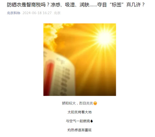 “北京科协”微信公众号丨防晒衣是智商税吗?凉感、吸湿、润肤……夺目“标签”真几许?