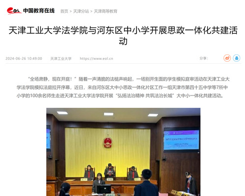 “全场肃静,现在开庭!”随着一声清脆的法槌声响起,一场别开生面的学生模拟庭审活动在天津工业大学法学院模拟法庭拉开序幕,近日,来自河东区大中小思政一体化片区工作一组天津市第四十五中学等7所中小学的100余名师生走进天津工业大学法学院开展“弘扬法治精神 共筑法治长城”大中小一体化共建活动。
