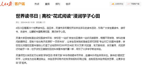 天津大学因地制宜创设校园读书环境:学校在“一站式”学生社区提供一站式阅读服务,根据不同学院、学科的借阅数据特征,定制个性化电子资源即“一页纸书展”,让学生在学院或宿舍区便可获取“专业对口”的图书信息;学校在北洋园校区图书馆精心打造了占地面积约260平方米的“天大文库”阅览室,集文献收藏、展示宣传、阅览研讨功能于一体;位于该校卫津路校区的科学图书馆修葺一新,吸引了众多学子前往体验。