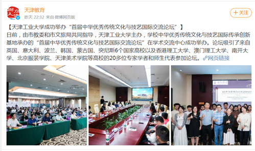 【天津工业大学成功举办“首届中华优秀传统文化与技艺国际交流论坛”】日前,由市教委和市文旅局共同指导,天津工业大学主办,学校中华优秀传统文化与技艺国际传承创新基地承办的“首届中华优秀传统文化与技艺国际交流论坛”在学术交流中心成功举办。论坛吸引了来自英国、意大利、波兰、韩国、蒙古国、突尼斯6个国家高校以及香港理工大学、澳门理工大学、南开大学、北京服装学院、天津美术学院等高校的20多位专家学者和师生代表参加论坛。