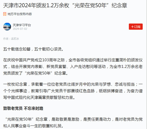 和平区专门举办“热血铸军魂 红心永向党”——“光荣在党50年”纪念章军休干部专场颁发活动,静海区开展迎庆“七一”新党员集体宣誓暨颁发“光荣在党50年”纪念章活动,武清区开展“牢记嘱托 善作善成 勇担职责使命 奋力‘五个跃升’”迎庆“七一”系列活动,为老党员颁发“光荣在党50年”纪念章,赠送“政治生日纪念卡”……